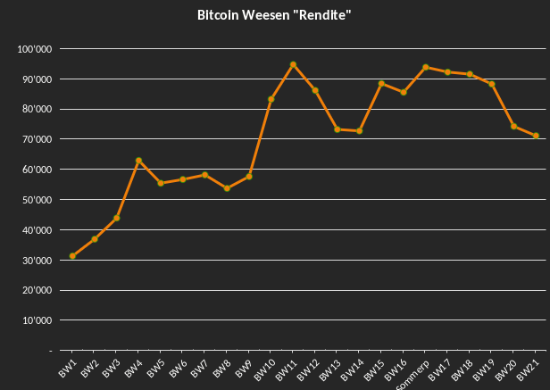 - Die Rendite, gemessen in Schweizer Franken, die diejenigen erzielt haben, die gleich nach unserem ersten Treffen Bitcoin gekauft haben. ↩︎